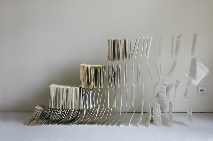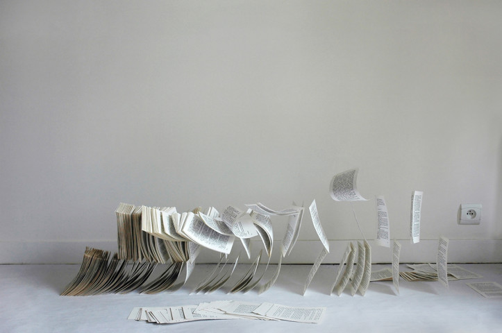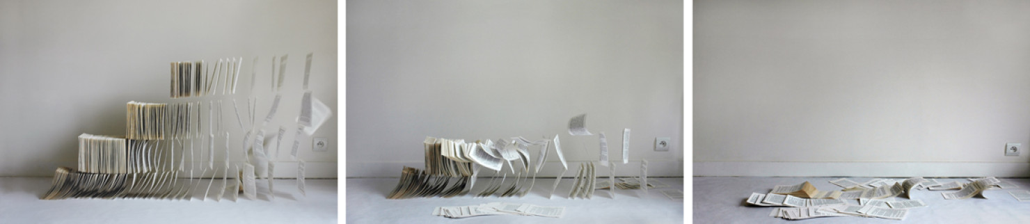 À la vidéo, trop narrative et à même de capter l'intégrité d'un processus, l'artiste préfère l'image fixe qui vient saisir l'instant, conserver l'état éphémère d'une forme. À la limite du noir et blanc, déployant tout un nuancier de gris, les clichés réalisés par l'artiste fonctionnent comme des outils spéculatifs venant figer un mouvement, un équilibre précaire et instable nés de manipulations diverses. L'artiste capte l'équilibre fragile des pages d'un livre, décomposé en trois photographies qui saisissent un moment qui n'est plus, surprenant par son absence tout autant que par la prégnance de son existence. Poésie et légèreté s'engouffrent parmi ces papiers pour créer une danse improbable.