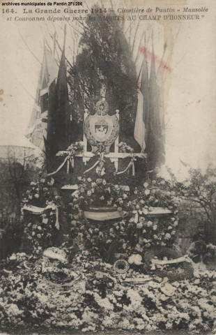 164. La grande guerre 1914 - Cimetière de Pantin - Mausolée et couronnes déposés pour les "morts au champ d'honneur".