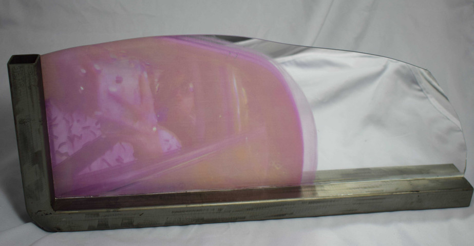 1/4 Retro Mirror, série FDT fait partie d'une série commencée fin 2021, Fenêtres de trains, à la recherche de sensations de vitesse et de mouvement, d'introspection et de capsules temporelles. C'est un quart de fenêtre qui a capturé un de ces moments uniques vécus lors d'un voyage, ces moments où notre corps est transporté par une machine mobile dotée de fenêtres, d'ouvertures sur différents paysages : train, voiture, où l'on se sent libre de penser, rêver, imaginer son propre monde, en regardant par la fenêtre. Ici c'est précisément une mise en abyme, car on discerne un personnage prenant en photo cette scène mobile dans un rétroviseur et ceci est finalement imprimé sur un miroir en forme de rétroviseur. C'est un selfie mis en abyme, un trajet capturé, illustré par ce geste métaleptique. Le miroir reflétant l'espace dans lequel l'œuvre est exposée, anime cette scène à l'infini et inclut le spectateur dans l'œuvre elle-même.