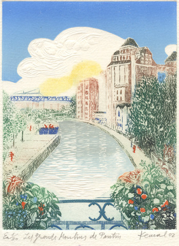 Kemal représente une vue depuis le pont de la mairie, on peut bien sûr y apercevoir les Grands Moulins avant sa reconversion architecturale qui aboutira en 2009, un bateau amarré sur les berges du canal ainsi que les structures bleues du parc de la Villette. Le canal de l'Ourcq guide le regard et amène de la profondeur à cette gravure. Les couleurs sont chatoyantes et la végétation donne un certain souffle à l'image.